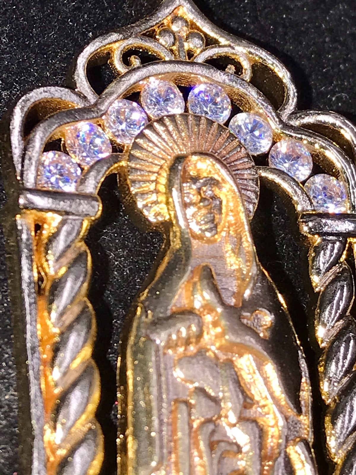 14K yellow gold bonded over pure 925 solid sterling silver Virgin Mary Maria Guadalupe charm pendant piece & matching 6mm Mariner Figaro link chain necklace sets on sale now! These fine sets are not only extremely elegant-looking, but have a full and total company guarantee to not tarnish or turn black!