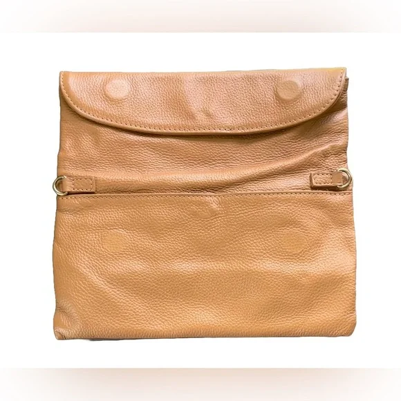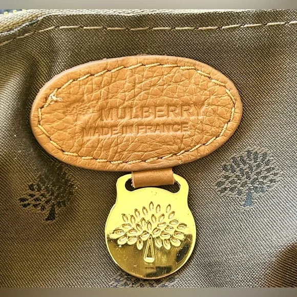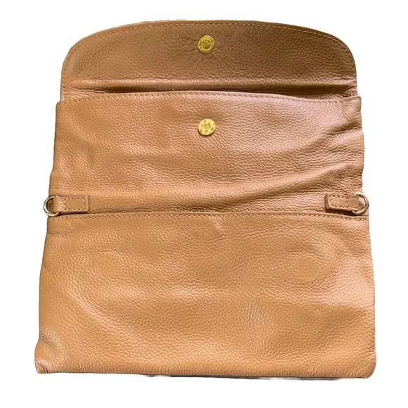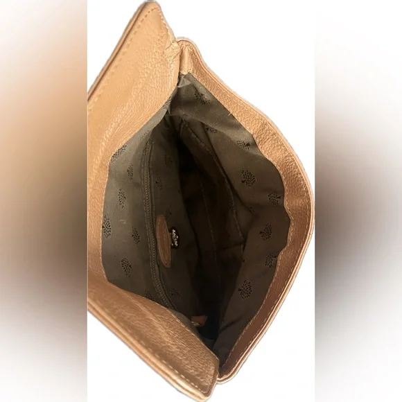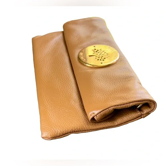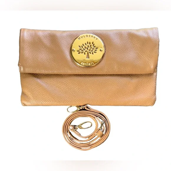 This is a beautiful and versatile Mulberry designer handbag, crafted in soft, pebbled tan leather and finished with gold-tone hardware. It features the iconic gold Mulberry tree logo plate on the front flap and comes with a detachable leather strap, making it perfect for use as a clutch or a crossbody bag.Features:• Brand: Mulberry• Color: Tan / Camel• Material: Genuine leather (pebbled texture)• Logo: Large round gold Mulberry tree logo plate• Strap: Adjustable and detachable leather strap with gold hardware• Interior: Main open compartment• Closure: Magnetic snap flap• Hardware: Gold-tone• Style: Crossbody, shoulder bag, clutchHeight: 6 inLength : 11 in