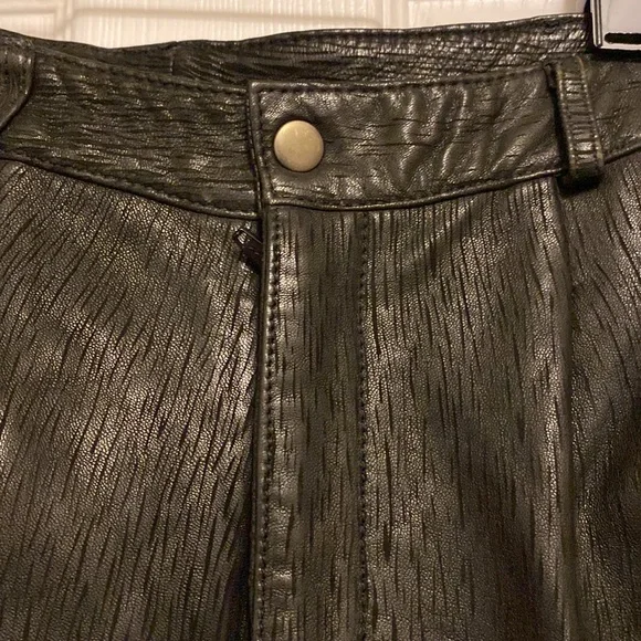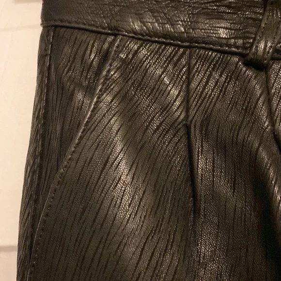 Long Black textured leather pants with a pockets on each side. One pocket in the back and the leather has a textured finish. Size 28