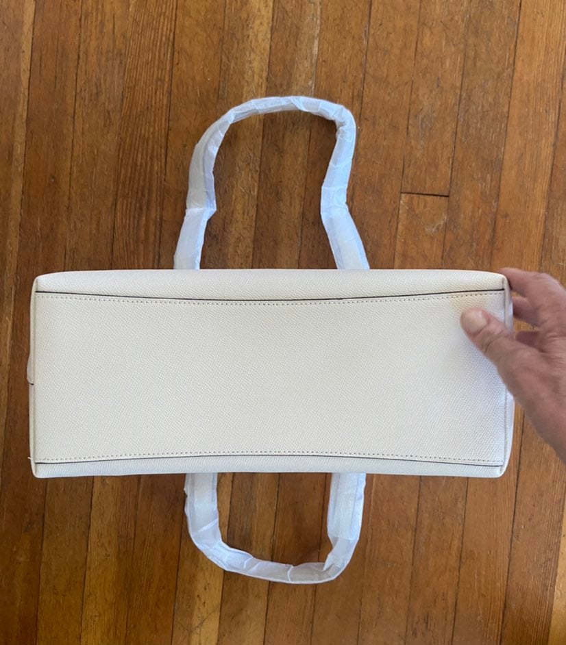 Coach Gallery tote bag in chalk color made of cross grain leather. Large enough to hold an iPad and possibly some laptops. The exterior pocket is approx 8.5” wide and 7” deep. There’s an interior zippered pocket that is approx 9.5” wide and 7” deep. Inside are also 2 slip pockets that are approx 4” wide and 5” deep (enough for most phones!). All other measurements are approx: