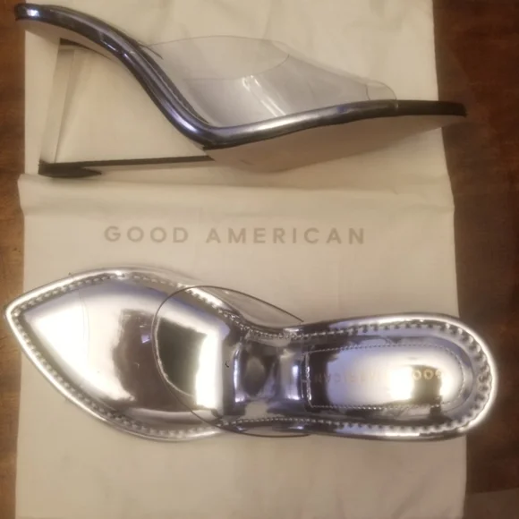 Good American Silver Mirror Clear Wedge Sandals & Dustbag(10) NEW
