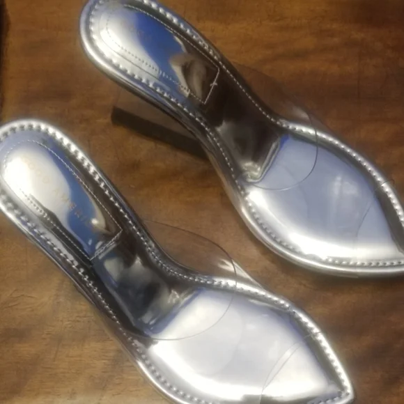 NEW. Step out in style with these elegant silver slip on shoes with a clear heels. Perfect for any occasion, these shoes offer both comfort and sophistication. Dustbag included.Pet & smoke free homeSame/next business day shippingBundle & saveTHANKS FOR SHOPPING @wapandapa🐼