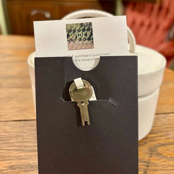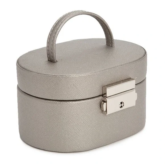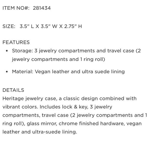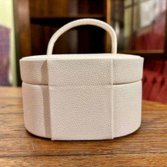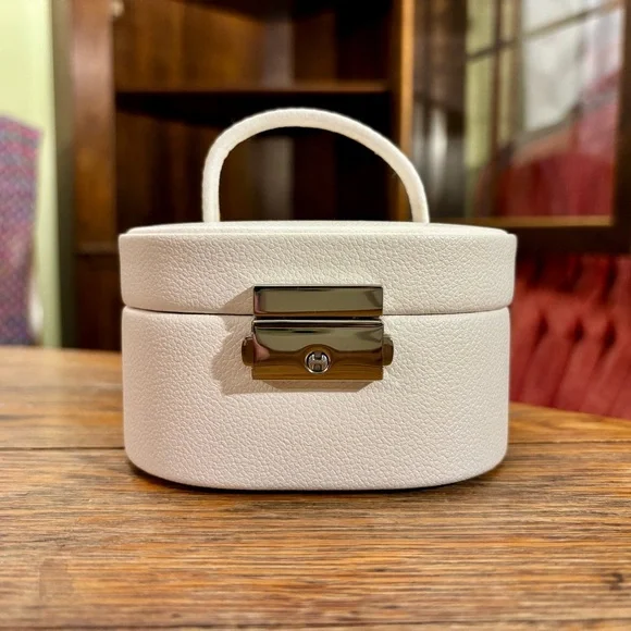 Heritage by Wolf Mini Oval Jewelry Box with Lock White Vegan Leather + Suede Brand New Never UsedSIZE: 3.5" L X 3.5" W X 2.75" HFEATURES• Storage: 3 jewelry compartments and travel case (2jewelry compartments and 1 ring roll)• Material: Vegan leather and ultra suede liningDETAILSHeritage jewelry case, a classic design combined with vibrant colors. Includes lock & key, 3 jewelry compartments, travel case (2 jewelry compartments and 1 ring roll), glass mirror, chrome finished hardware, vegan leather and ultra-suede lining.