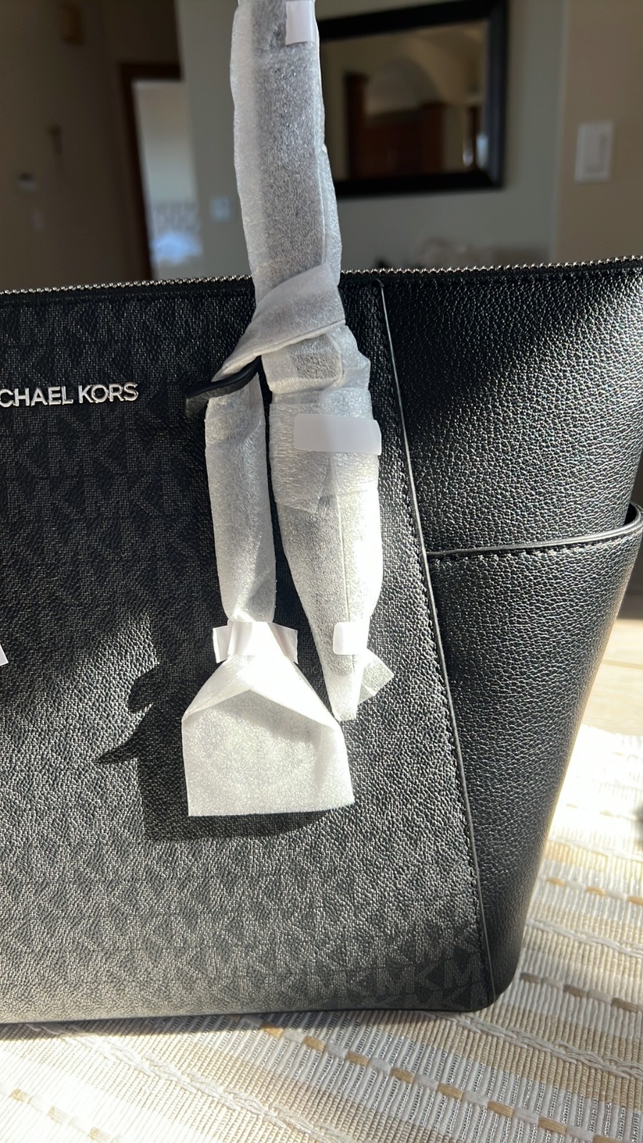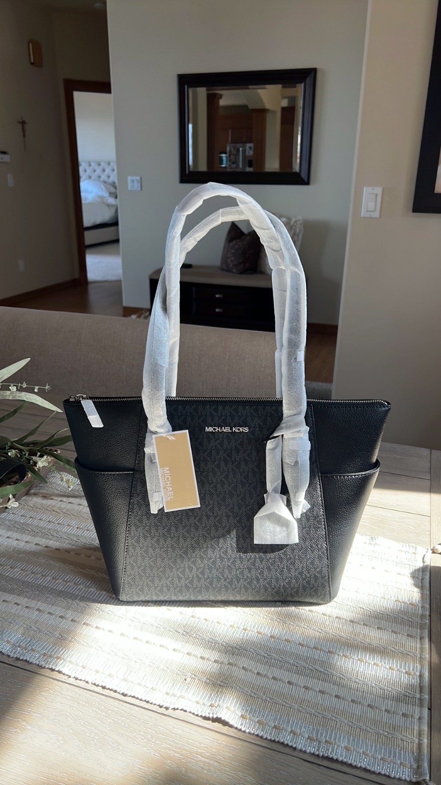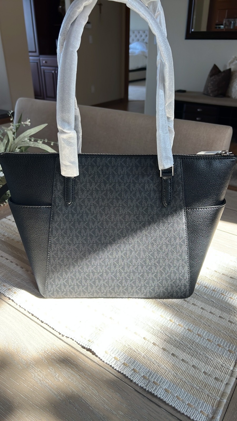 Chic Michael Kors tote with signature MK pattern and black Saffiano leather. This stylish Charlotte large tote with two shoulder straps and easy access side pockets is perfect for travel or everyday. The interior is roomy and has a single large zip pocket for your essentials.