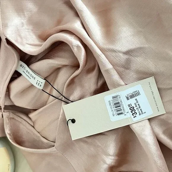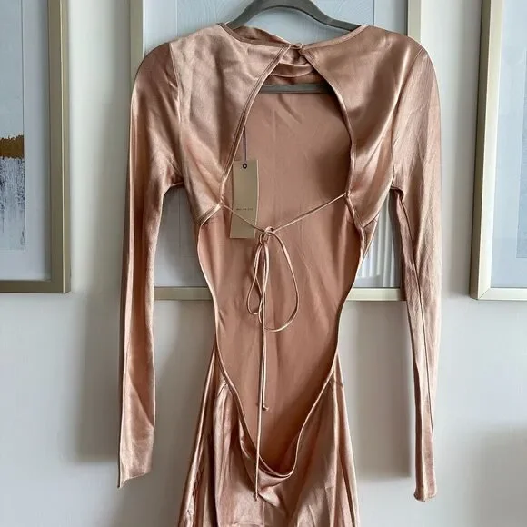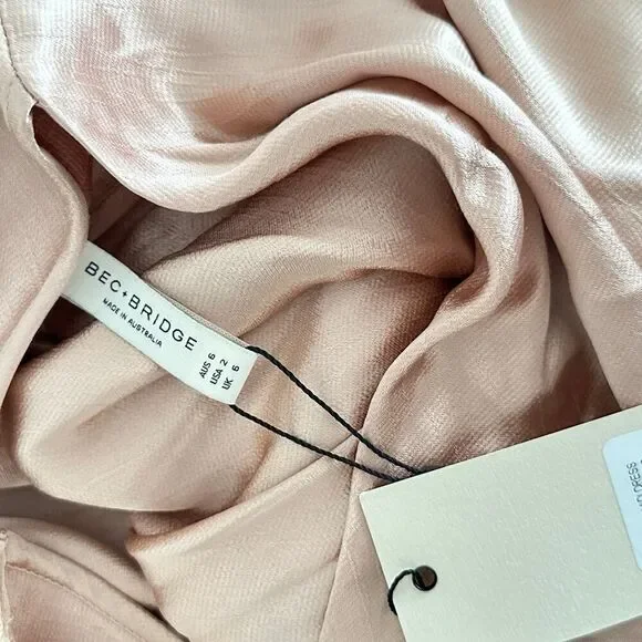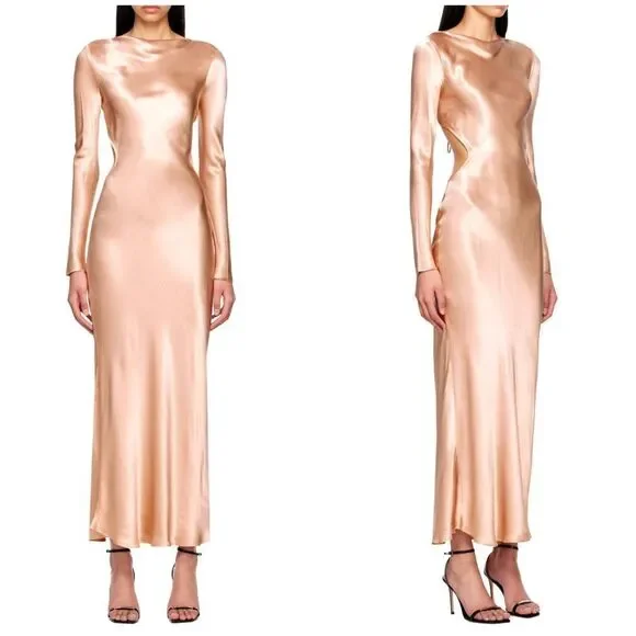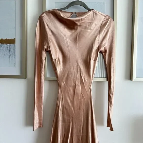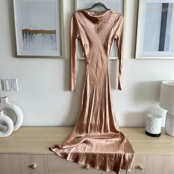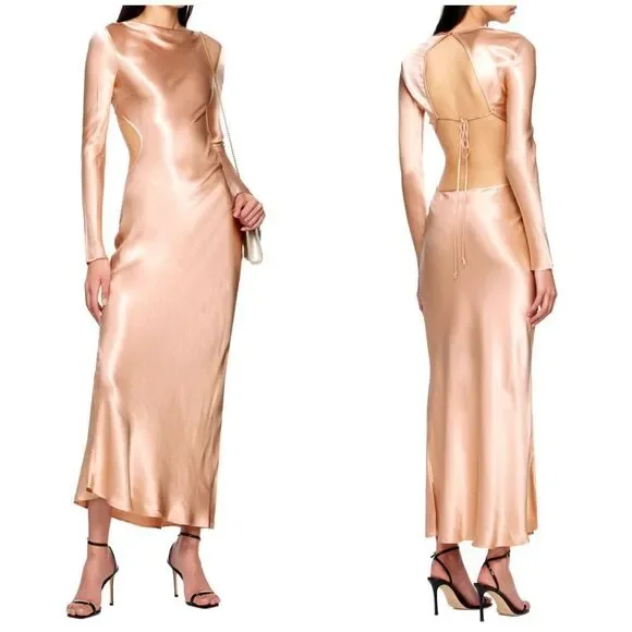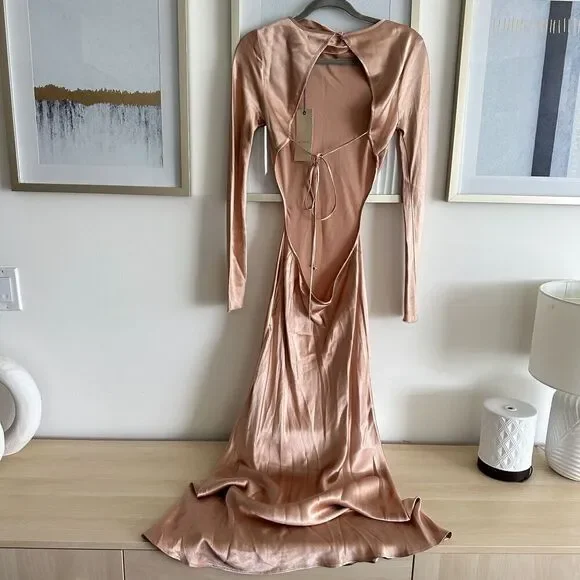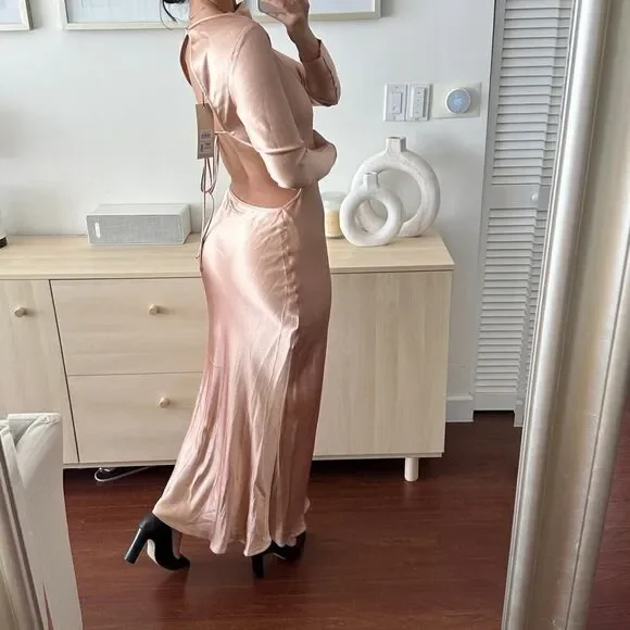 BEC & BRIDGE REN Long Sleeve Maxi Dress, Rose GoldCowl neck· Raw edge at cuffs· Button fastening at back collar· Cutout and self-tie straps at open backSupplier color: Rose gold100% viscose.Made in Australia.New with tag- US size 2 - UK size 6NOTE : model is wearing a US size 4 on the pictures, fits true to size.