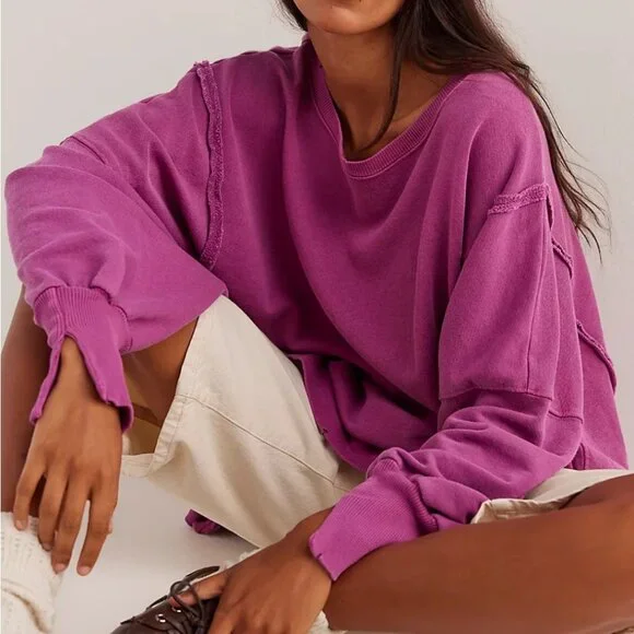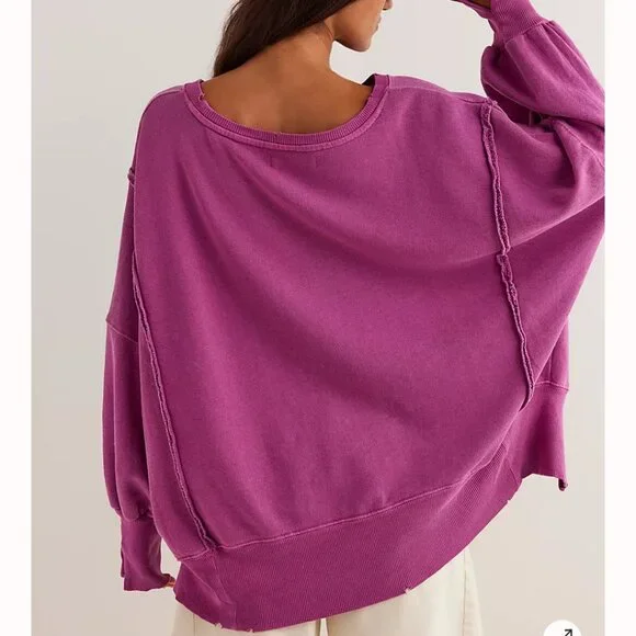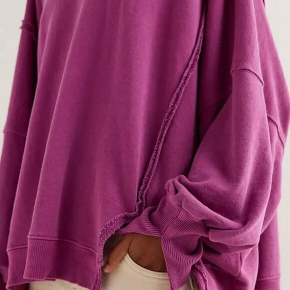 The definition of an effortless essential, this cool and classic pullover is featured in an oversized, slouchy fit with raw, exposed seaming throughout for a true lived-in look.Fit: Oversized, slouchy fit, slightly lower back hemlineFeatures: Soft fabrication, wide scoop neck, exposed seaming throughout, side-slit detailingWhy We <3 It: A need-now wardrobe staple, this sweatshirt is perfect for throwing on and heading out.Color: Purple OrchidMeasurements for size smallBust: 69 inSleeve Length: 27.25 inLength: 15 in