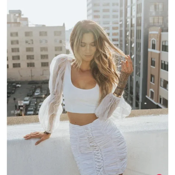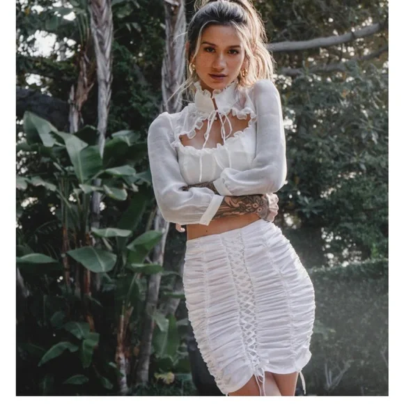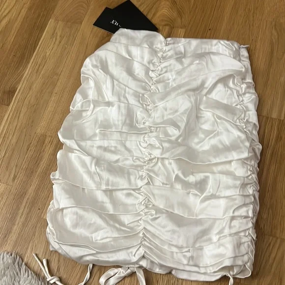 A ruched, Silk skirt with adjustable drawstrings makes this skirt an evening/ everyday wear staple. Ruched details. Concealed back zip closure. Adjustable hem. In White.- 100% Silk2:Waist: 24.25"; Hips: 31.5"; Length: 15.25”