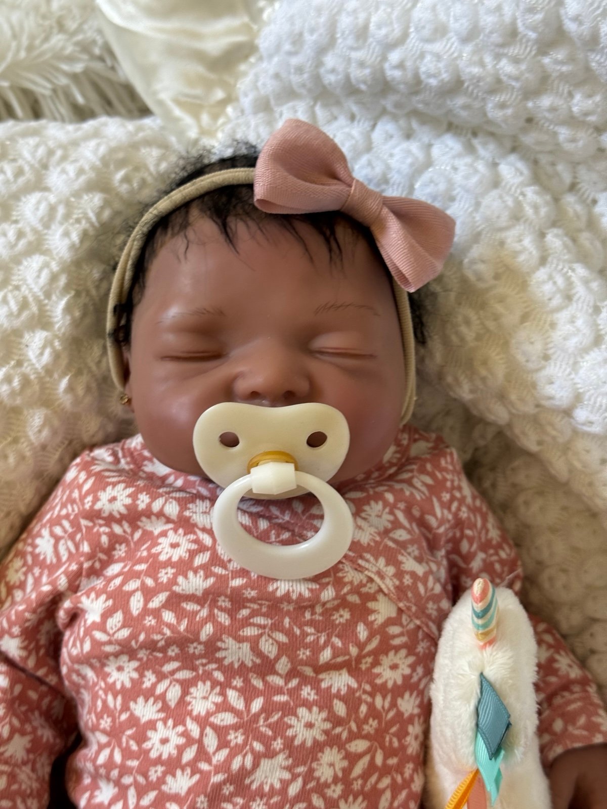This sweet sleeping reborn by Sheila Michael is so precious. She's about 16 inches long with a lightly weighted cloth body and very soft pliable (squishy) arms and legs. She has pierced ears and a magnetic paci. She will come with the outfits pictured and diaper and paci. She looks so life like and is so cuddly and sweet. She has a belly plate but it could be removed if you wanted to. Home is smoke and pet free.