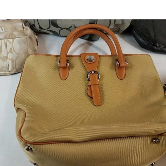 Absolutely stunning in new without tagA great size tote for room without the bulk. Made of jacquard exterior with leather trims. Double leather handles. Leather imprinted RIONI Moda Italia. Magnetic buckle closure. Top zipper opens to zipper pocket, cell phone holder pouch, and side pouch. Interior goldenrod fabric RIONI monogram print lining for tote in apricot. Back zipper pocket for added room. Steel feet on bottom of back for reinforced support and durability.dimensions approximately L14 x W4 x H12"drop length:6.5" StrapJust need minor cleaning one part of purse will add photo in right lightening