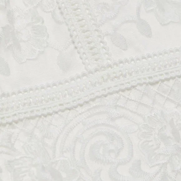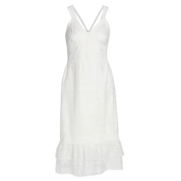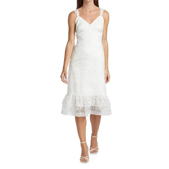 DescriptionBrand: THEIACondition: New with tags, 100% AuthenticSize: 6Color: WhiteMaterial: 100% PolyesterApproximate Measurements (taken from front side of item while laying flat): Armpit to armpit " / Length from shoulder to hem - 44"Retail: $295FeaturesIntricate lace and embroidered tea-length dress with a defined bodice and tiered sheer hem.V necklineSleevelessOpen criss-cross backHidden back zipTonal self-tie on back waistStyle tags:elegant, tea, brunch, wedding, bridal, spring, summer, bachelorette, brocade, embroidery, rehearsal dinner, prom, BHLDN
