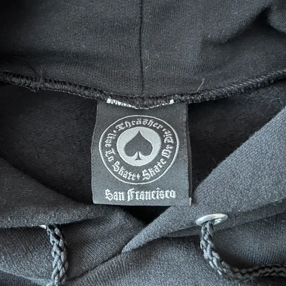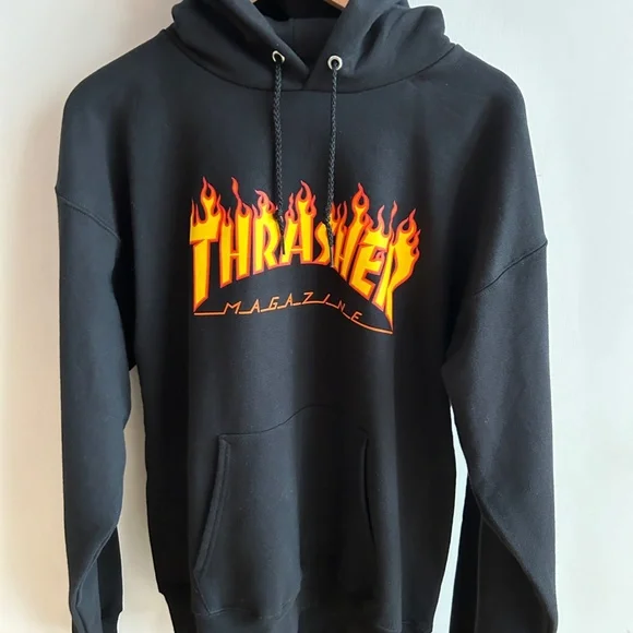 This is an authentic, premium version of the Black Flame hoodie by Thrasher Magazine San Francisco. Standard fit hoodie woven in 90% cotton and 10% polyester (the ones they sell now only have 50% cotton / 50% polyester). Featuring an adjustable drawcord, kangaroo pocket and finished with artwork at center-chest.This hoodie was bought in 2022 but only worn and washed once. Looks brand new. Thank you for considering!