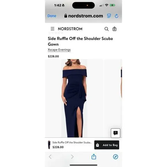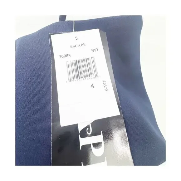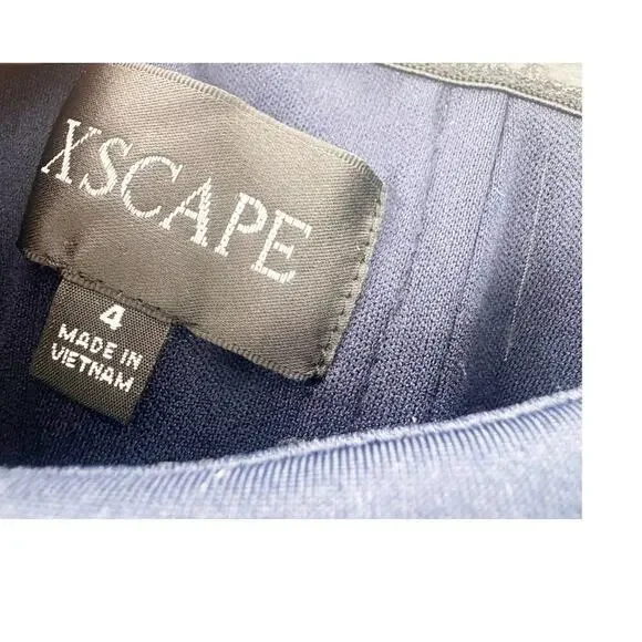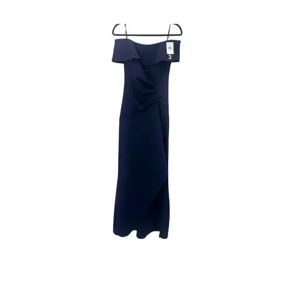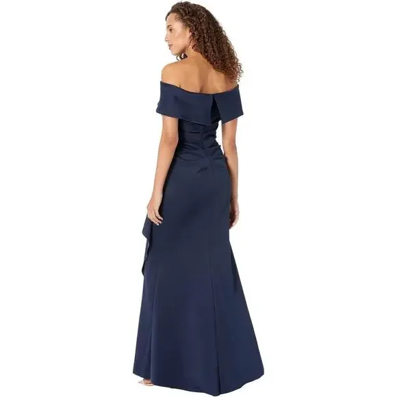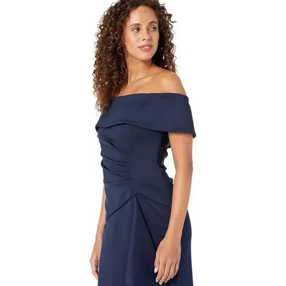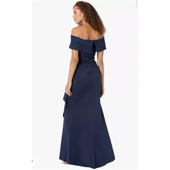 Xscape Women's Long Scuba Off-The-Shoulder Dress Navy Size 4 NWT. You're sure to stun with the XSCAPE Long Scuba Off-the-Shoulder Dress! Figure-skimming gown features asymmetric ruching at bodice and asymmetric ruffle detail at left hip. Full-length skirt with straight hem. Ruched detailing and zip closure at center back. 95% polyester, 5% spandex.dress, women, off the shoulder, navy, gown, straight, zipper, party, cocktail, wedding, mother of the bride, winter, summer, spring, fall. xscape 1