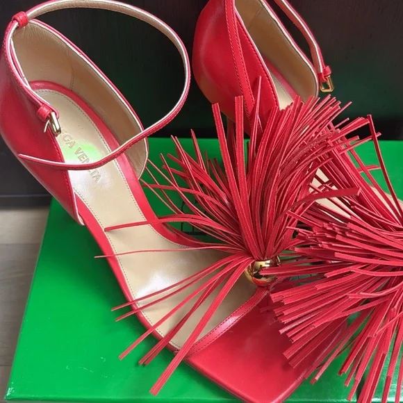 These striking red heels from Bottega Veneta feature a dramatic fringe detail on the front, adding a bold statement to any outfit. Crafted with thin straps that elegantly wrap around the foot and ankle, these shoes offer a sophisticated and stylish look. The medium to high slim heel enhances the overall elegance, making them perfect for special occasions.
