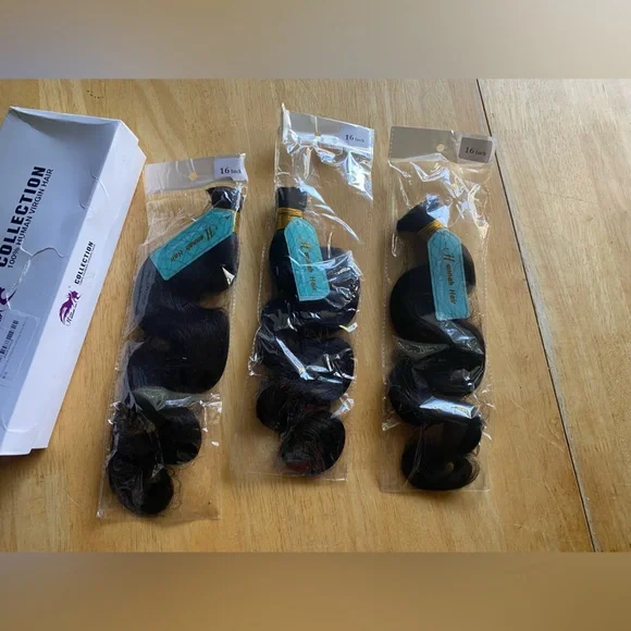 Brand new100% human hairNatural black 1BBody wave 16in3 bundles 100g each All pictures are taken in natural sunlight indoors 🌞 Priced at 50% off retail 😎Check out my closet for more wigs and extensions 😆Bundle 2+ save 20% more 🥰Price is firm unless bundled!*Pictures are unboxing pictures, taken straight from the mailbox. Your item will come exactly as pictured, not pre-styled or plucked as shown in vendor pics